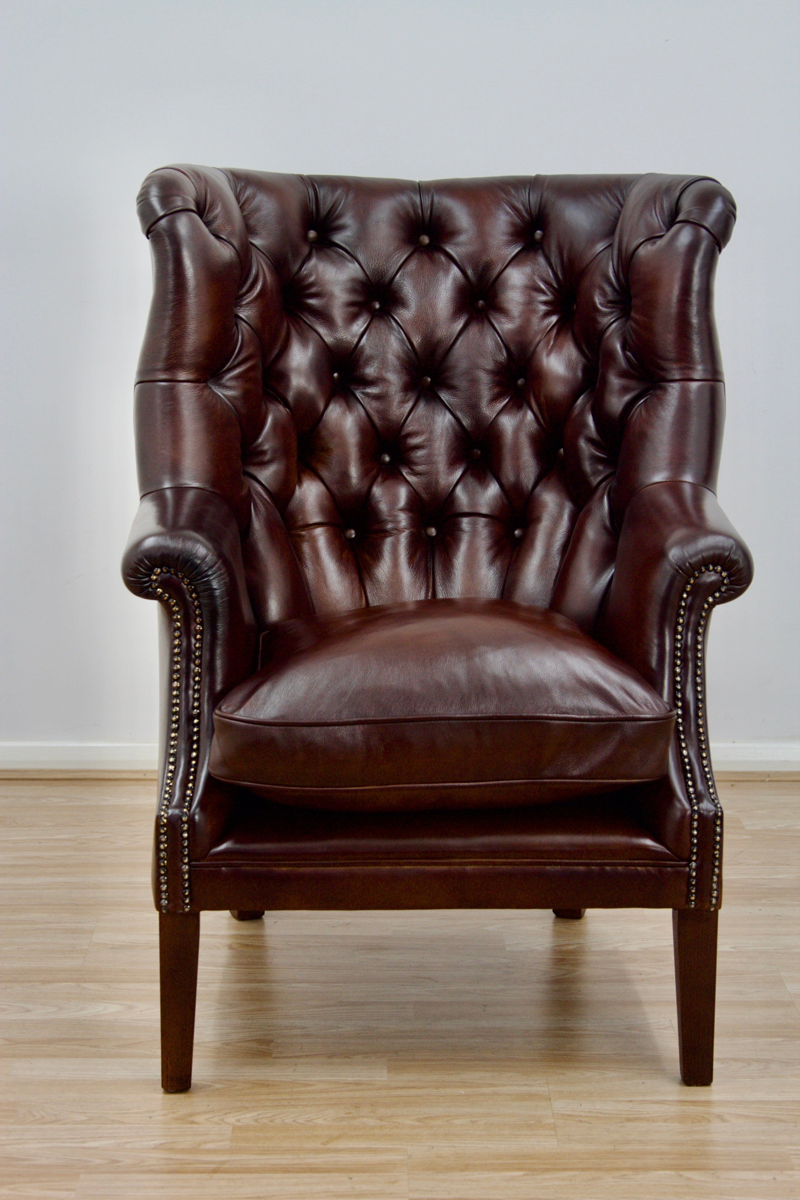 With a hand-studded trim and magnificent wings, evokes a period feel reminiscent of an antique heirloom. Create the same look in your home by choosing upholstery as priced and pictured in Hand Antiqued Leather.